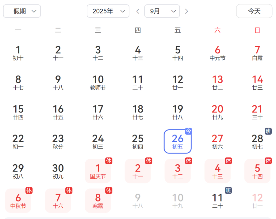放假時間:2025.10.01(星期三)—2025.10.08(星期三)放假,共8天;